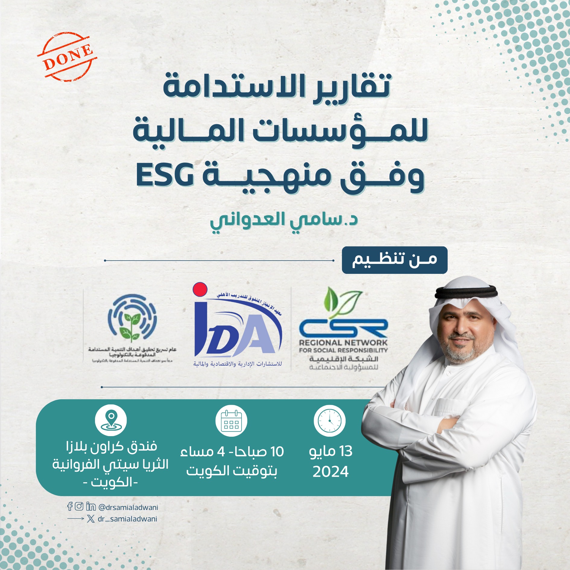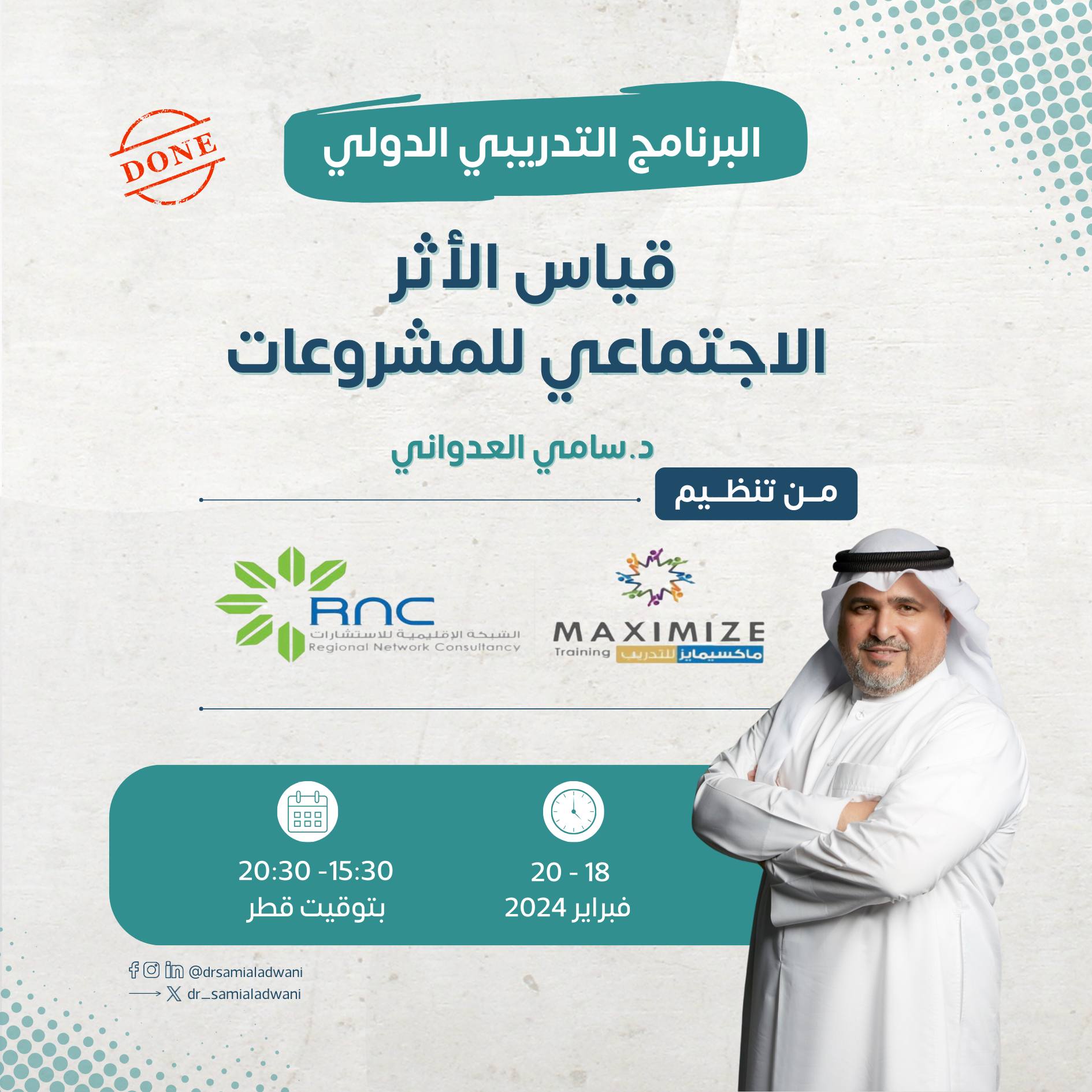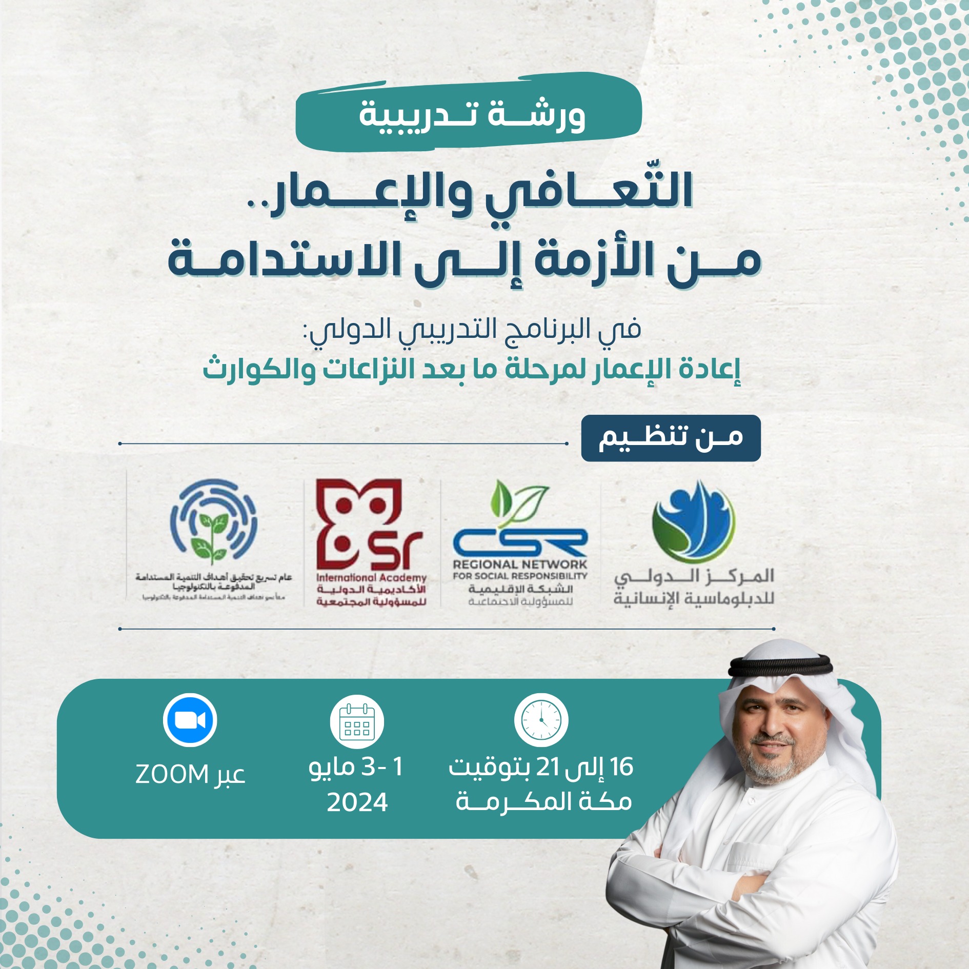 كان للدكتور العدواني مداخلة في البرنامج التدريبي الدولي في موضوع “إعادة الإعمار لمرحلة ما بعد النزاعات والكوارث” أيام 1-3 مايو 2024، عنوانها “التعّافي والاعمار، من الأزمة إلى الاستدامة”.