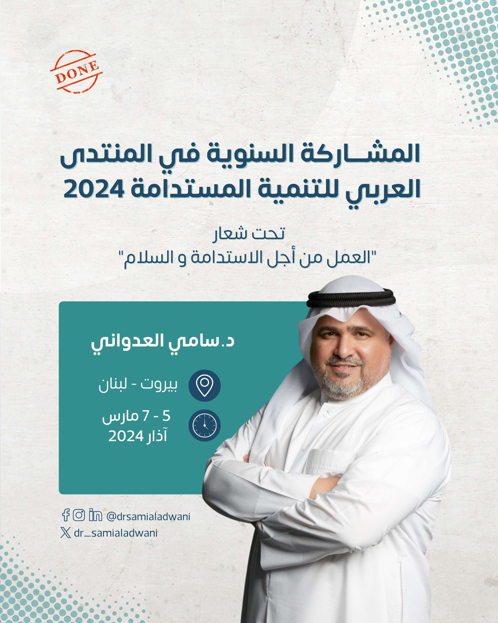 أعود للمشاركة في المنتدى العربي للتنمية المستدامة، تلك المنصة التي أستلهم من زادها وقودًا معرفيًا، وإنتاجًا فكريًا، وممارساتٍ ناضجة في مجالات الريادة.