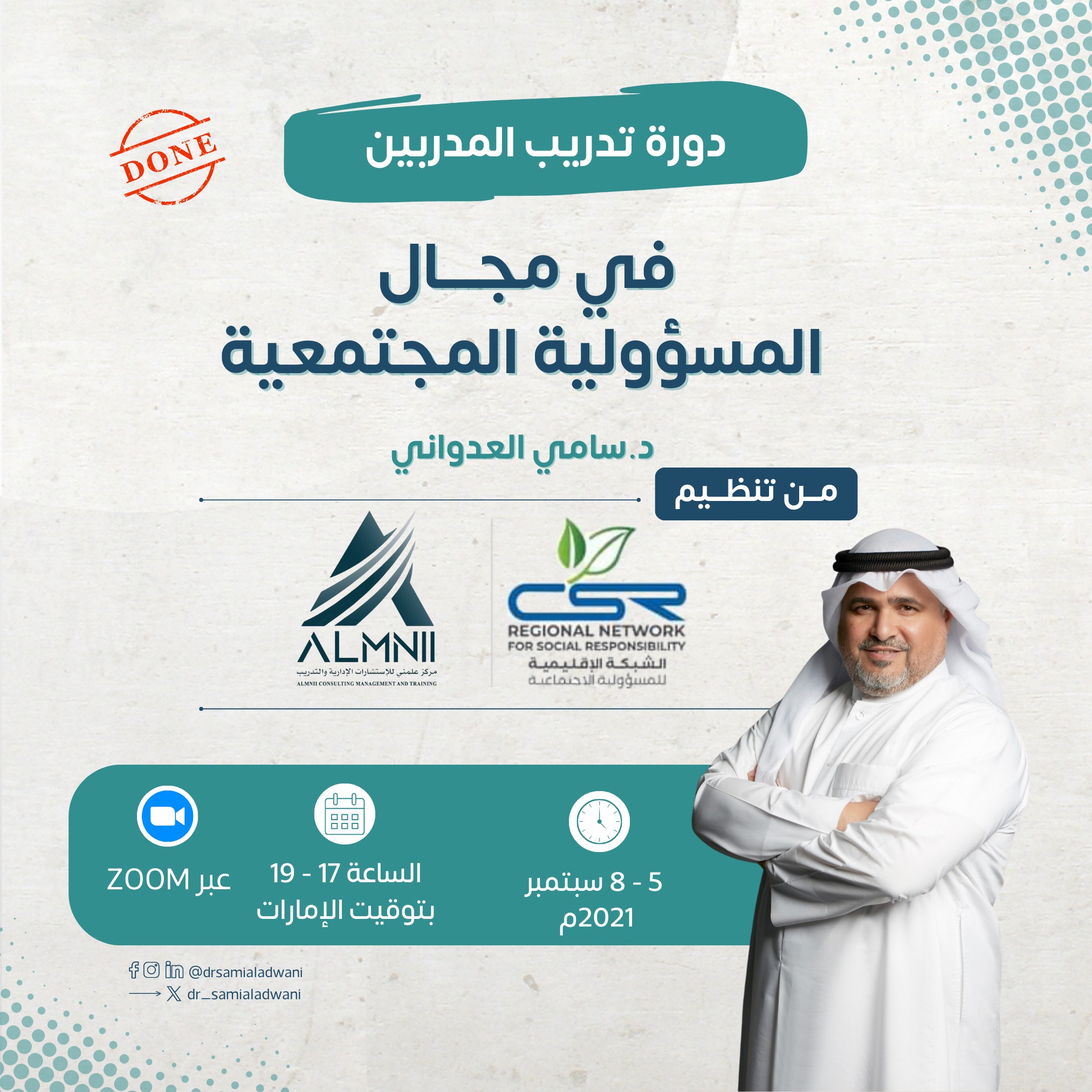 ضمن مبادرة الشبكة الإقليمية للمسؤولية الاجتماعية تشرفت بتقديم برنامج تدريبي في مهارات تقديم الخدمات الاستشارية المهنية يوم 10 نوفمبر 2021م عن العملية الاستشارية ومعاييرها ومقوماتها الأساسية.
