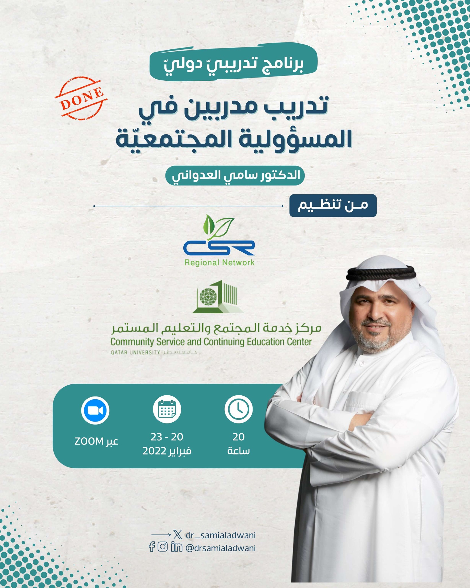 في 20 ساعة تدريبية مكثفة، اختتم بنجاح البرنامج الدولي “تدريب مدربين في مجال المسؤولية المجتمعية”، الذي قدّمه الدكتور سامي العدواني، بتنظيم مركز خدمة المجتمع والتعليم المستمر بقطر، وبالشراكة مع الشبكة الإقليمية للمسؤولية الاجتماعية.
