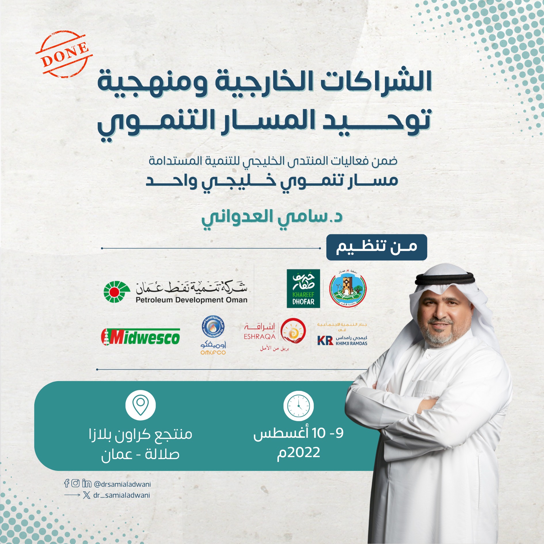 كانت لي ورشة تفاعلية تحت وسم “الشراكات الخليجية ومنهجية توحيد المسار التنموي” سعدت بتقديمها ضمن فعاليات المنتدى الخليجي للتنمية المستدامة الذي رفع شعار “مسار تنموي خليجي واحد” في أغسطس قبل سنتين بسلطنة عمان، تناولت فيه آليات منهجية لتوحيد مسارات وجهود الخليج الواحد من أجل تحقيق التنمية المستدامة.